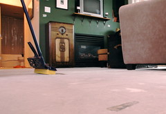 Subsequent to the flood a couple of weeks back, the good people at ServiceMaster came by on Friday and pulled up our floor. Now we’re living on the bare concrete until we get a new (free, happily) floor. It’s a bit austere: