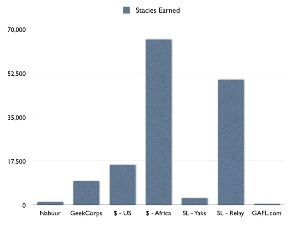 They sold over 200 yaks, raising 225,000 Linden dollars. That works out to about $800 in US dollars. I wasn’t able to figure out how many actual yaks that would buy, but let’s assume the money goes to food aid in the developing world. That would earn about 2700 Stacies.